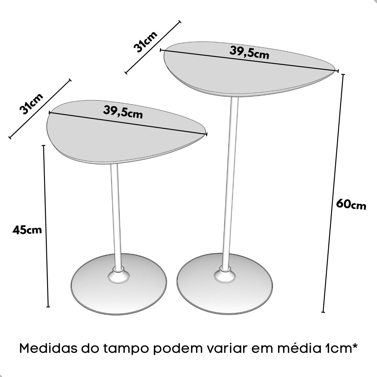 • Altura: 60 cm | Tampo orgânico: aproximadamente 39,5 cm x 31 cm